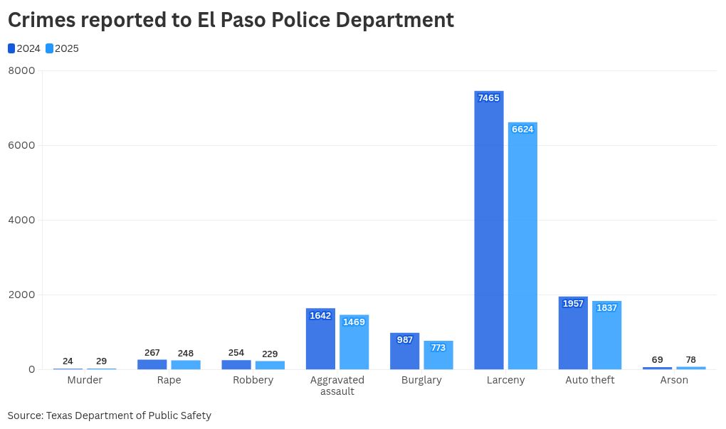 El Departamento de Policía de El Paso informó que los delitos graves —incluyendo homicidio, robo, violación, asalto agravado, allanamiento, hurto, robo de vehículos e incendio provocado— bajaron un 11% en comparación con el año anterior.