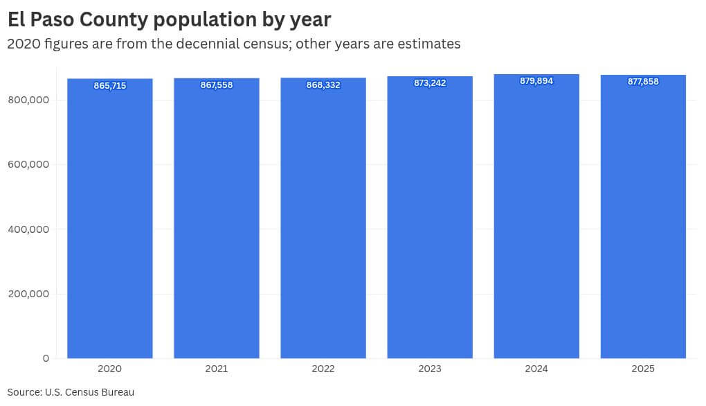 - El condado de El Paso perdió más de 2.000 residentes en 2025, reduciendo su población estimada a 877.855 personas.